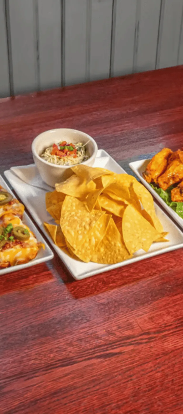 8 Piping Hot Potato Skins Severed With Melted Cheese, Jalapenos, Chives, Topped With Bacon And Served With A Side Of Lettuce, Pico And Sour Cream