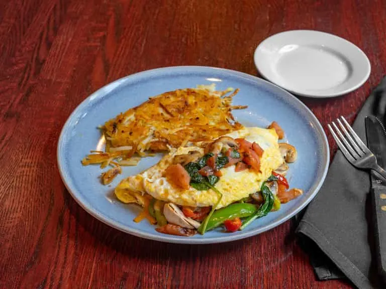 3-egg omelet brimming with fresh spinach, sauteed mushrooms, bell peppers, and ripe tomatoes. All together with mixed cheese served with a crispy hashbrown.