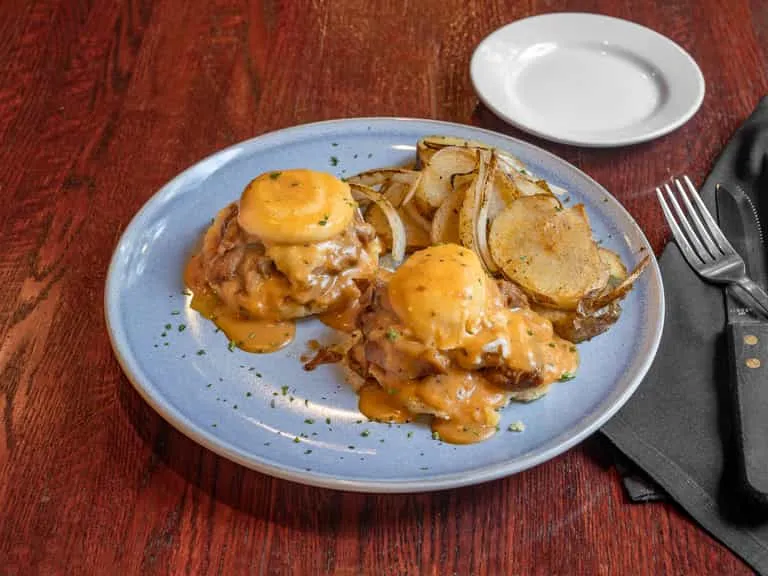 Fluffy buttermilk biscuits smothered in rich savory gravy, served with 2 eggs. With a choice of bacon, ham, or sausage.